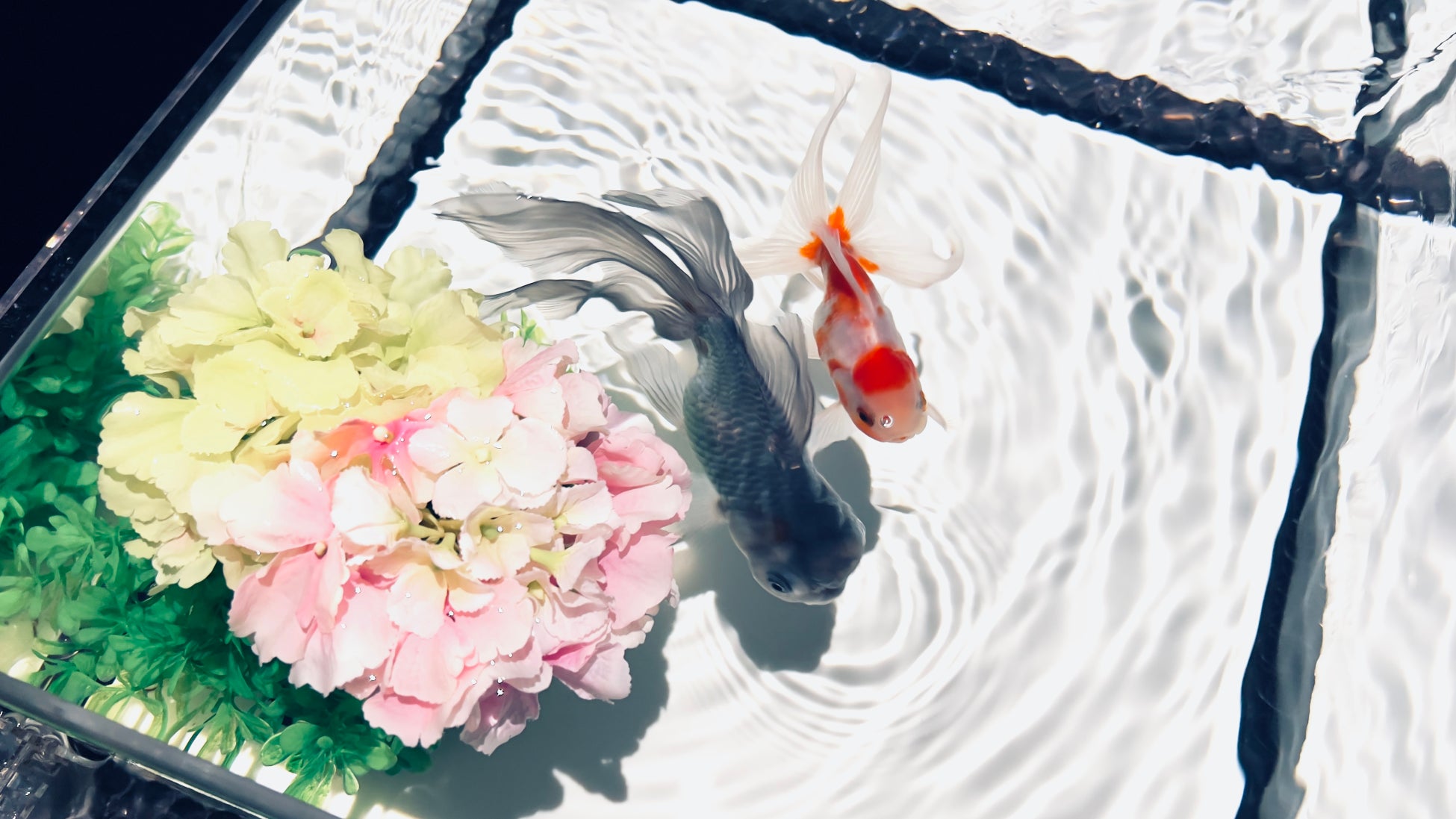 様々な種類の金魚を上から鑑賞できる作品“新金魚品評”では、水槽内を紫陽花が彩り、金魚泳ぐ空間も初夏らしい景色が広がります。