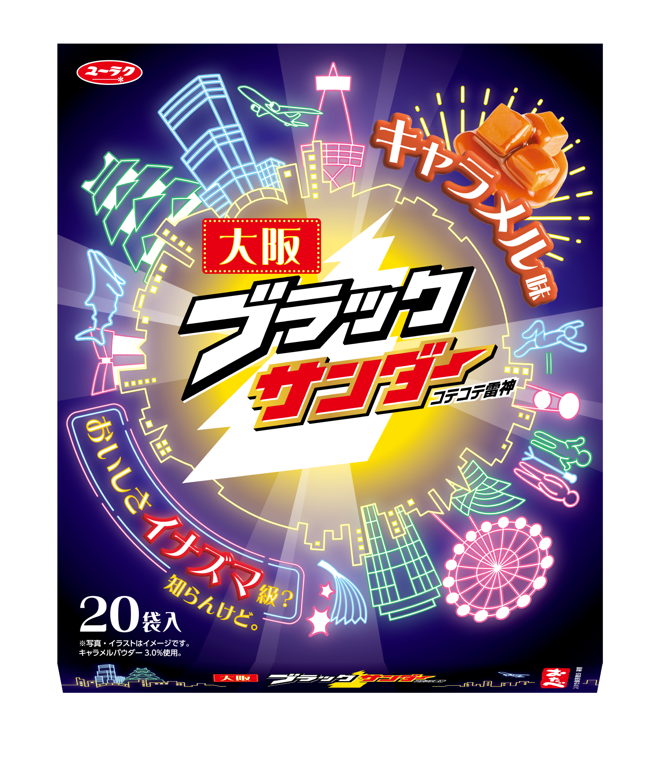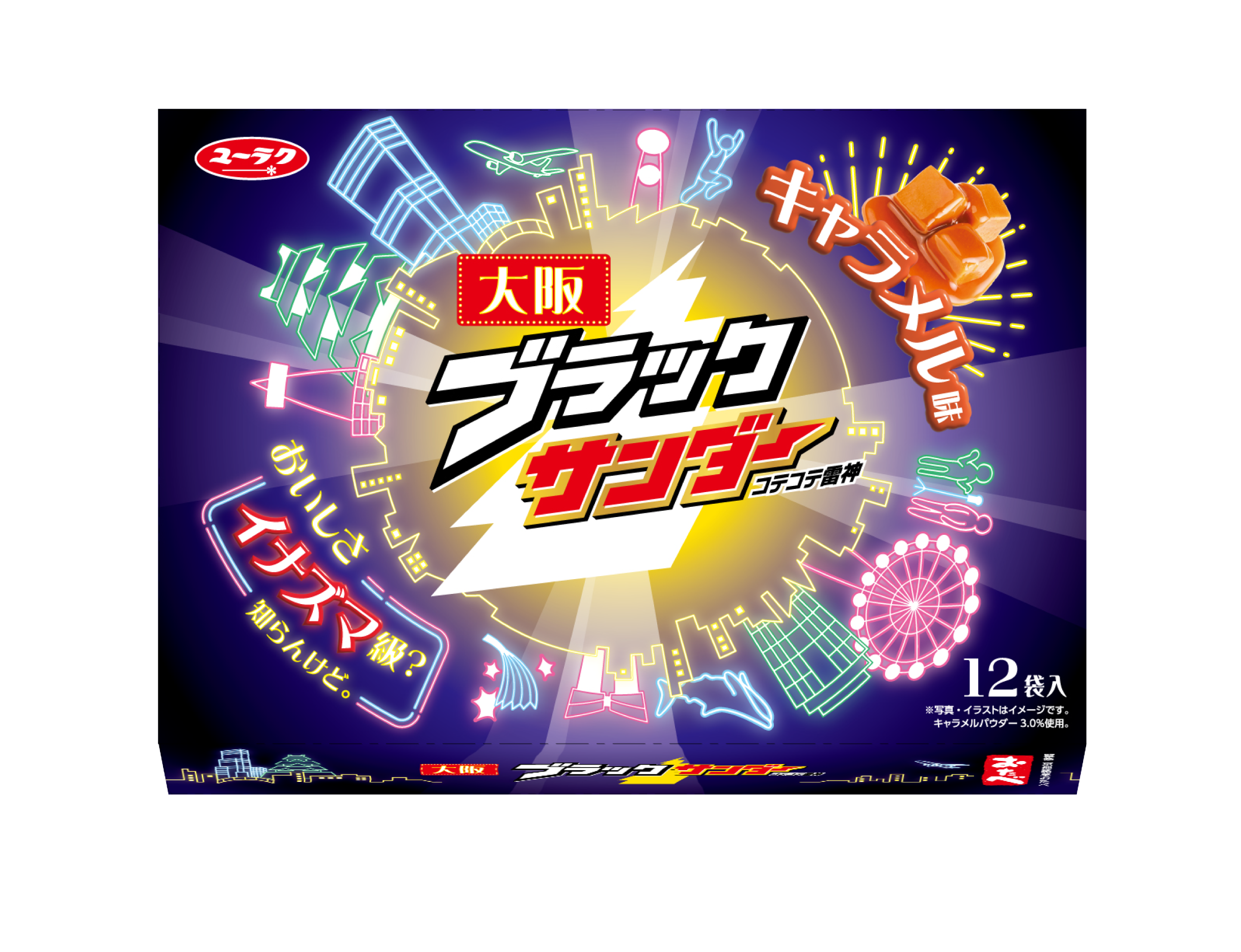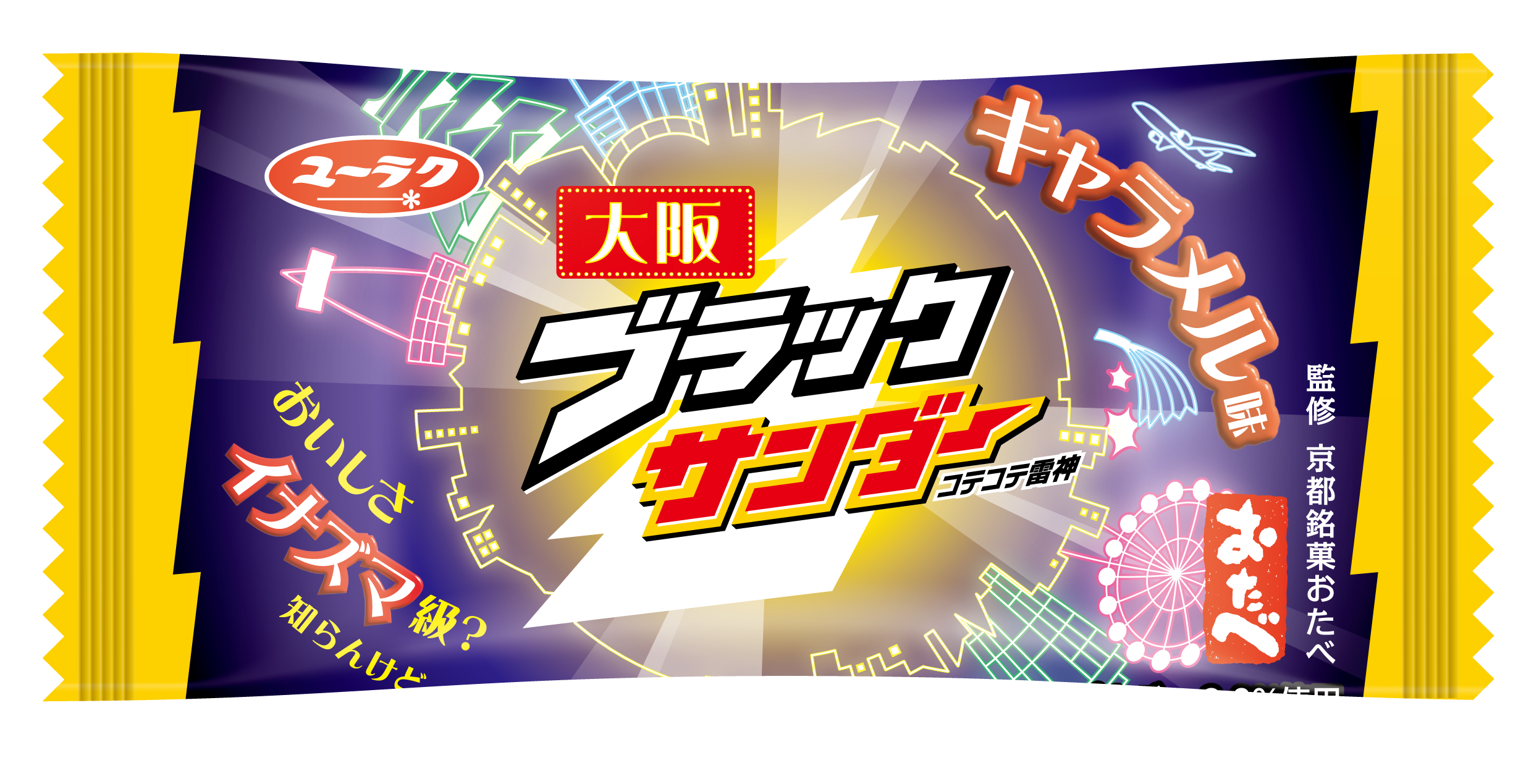 2018年の発売以降、ご好評いただいております「京都ブラックサンダー」の展開後、社内外から「なんで京都にはあるのに大阪にはないねん…!」とのご意見をいただき、この度「ほな作ったろ!」とのことで大阪ブラックサンダーが新登場! ブラックサンダーと大阪の楽しさがたっぷり詰まったコテコテなキャラメル味のブラックサンダーを開発いたしました。