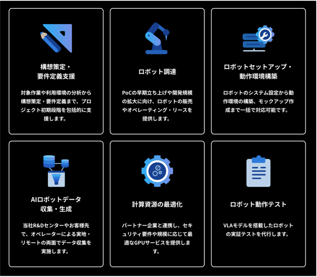 世界・日本のロボティクス市場は今後の5年から10年程度の期間で急成長が見込まれており、その中でもAI技術を組み込んだAIロボティクスは、従来の産業用ロボットの枠を超え、製造業、建設業、物流、医療、サービス業など幅広い領域での応用が期待されています。AIロボティクスは、労働人口減少への対応、生産性向上、安全性確保といった社会課題を解決する鍵として、企業・研究機関による投資が加速していくことが見込まれます。しかし、実用化に至るまでには依然として高いハードルがあり、たとえば、開発初期段階での構想策定や要件定義の不確実性、ハードウェア調達のコスト・時間、学習に必要な大量かつ高精度のデータ不足、計算資源のボトルネック、そして実環境下での動作検証における効率性の欠如などが挙げられます。これらは多くの企業にとって「研究から事業化」への移行を妨げる要因となっています。当社はこれらの課題解決に向け、AIロボットデータソリューションとして、「構想策定・要件定義支援」「ロボット調達」「ロボットセットアップ・動作環境構築」「AIロボットデータ収集・生成」「計算資源最適化」「ロボット動作テスト」といったソリューションを提供します。本ソリューションの提供により、VLAモデルの研究開発に際しての学習データに必要不可欠な「大規模データの生産」を行い、研究開発から社会実装までのプロセスを短縮し、企業が持つ技術の事業化を後押していくことを目指していきます。