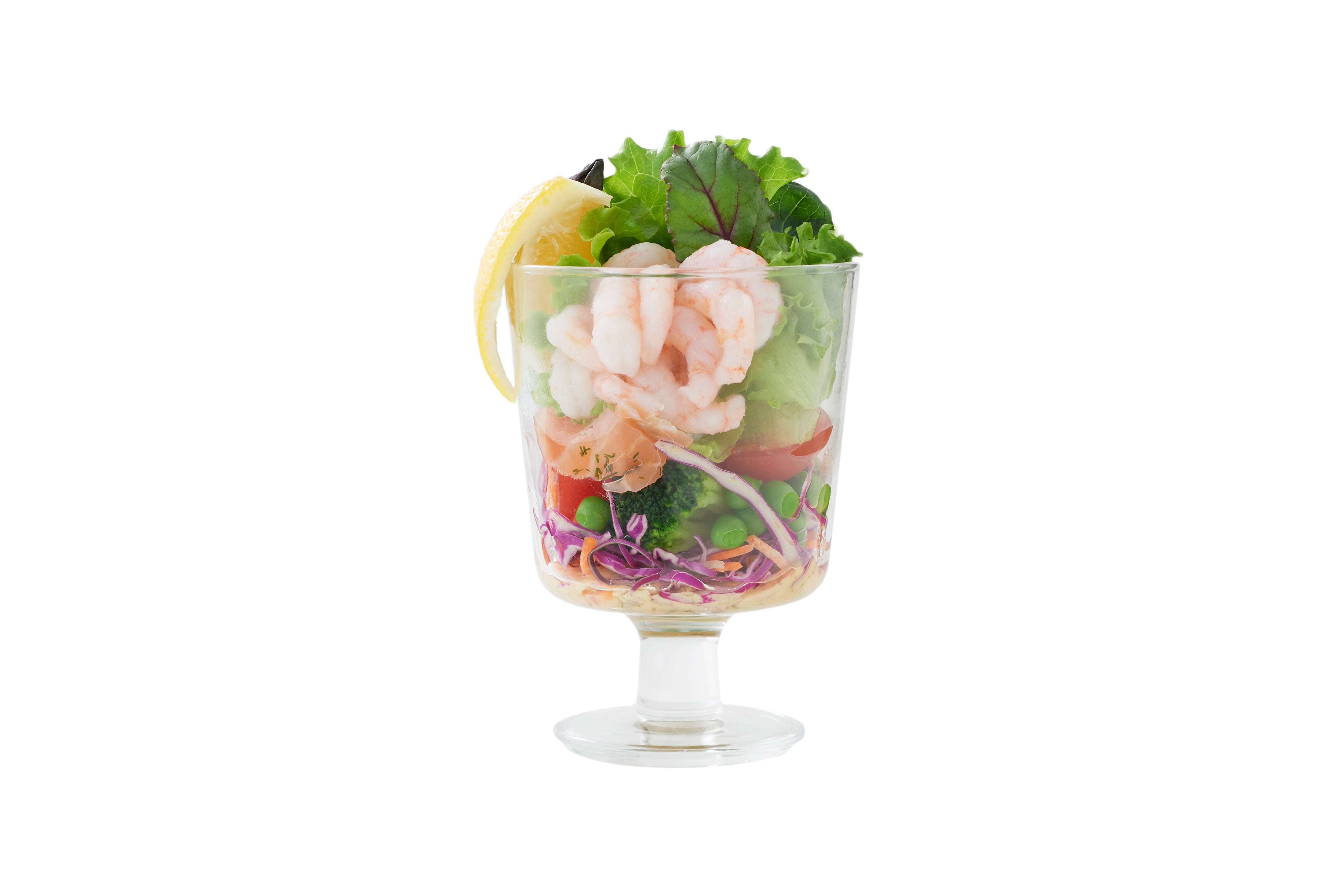 MSC認証のむきエビ、ASC認証のサーモンを使った、サステナブルかつ、見た目も綺麗なグラスサラダ。サーモンソースとレモンを絞って召し上がれ。