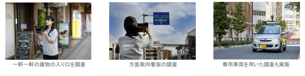 ゼンリンは、国内カーナビゲーション用の地図データでトップシェアを持ち、独自調査から収集・整備した地図データをナビメーカー等に提供しています。全国に約70か所の調査拠点を保有し、建物の入り口情報や方面案内看板、道路規制情報など、カーナビゲーション機能の向上に貢献する詳細な情報を整備・提供しています。