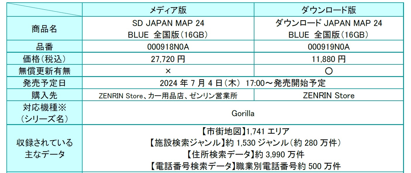 株式会社ゼンリン(本社:福岡県北九州市、代表取締役社長:髙山善司、以下ゼンリン)は、パナソニック製カーナビ「Gorilla」向け更新地図の2024年度版「JAPAN MAP 24」の販売を、2024年7月4日(木)より開始します。道路データを2か月ごとに無償で更新できるダウンロード版(更新可能期間:2025年6月30日まで/「ZENRIN Store」のみでの販売)と、SDカードに最新の地図情報を収録したメディア版(「ZENRIN Store」、カー用品店、ゼンリン営業所での販売)の2種類での販売となります。