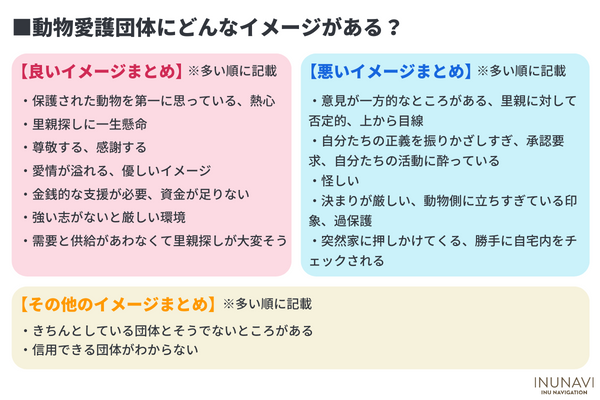 - 動物愛護団体のイメージは「保護された動物を第一に思っている」「意見が一方的」