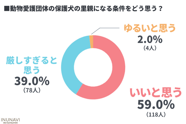 ・動物愛護団体の里親になる条件は「いいと思う」が59.0%で最多となったが、「厳しすぎる」と回答した人の中には現代社会にあっていないことを指摘する声も多く見られた。
