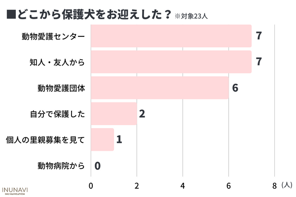 - 保護犬をお迎えした場所は「動物愛護センター」「知人・友人」7人が僅差でトップに