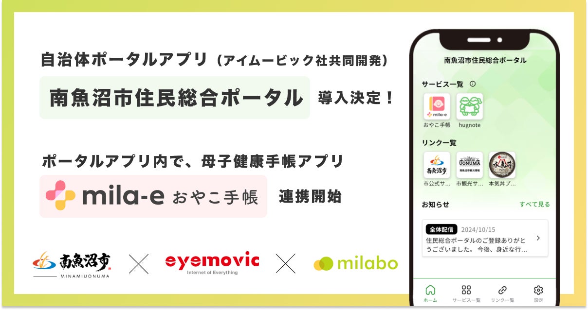 ミラボ、新潟県南魚沼市で「南魚沼市住民総合ポータル」(アイムービック社共同開発)導入決定!アプリ内で、母子手帳アプリ「mila-e(ミライー) おやこ手帳」連携開始