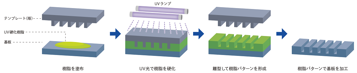 NIL技術は、半導体製造のリソグラフィ工程といわれる微細パターンを形成する工程で使われています。ArF(フッ素化アルゴン)液浸技術やEUV技術など従来の光露光技術と異なり、基板上に塗布した樹脂上に微細な凹凸パターンを形成した版を押し当てパターンを転写します。