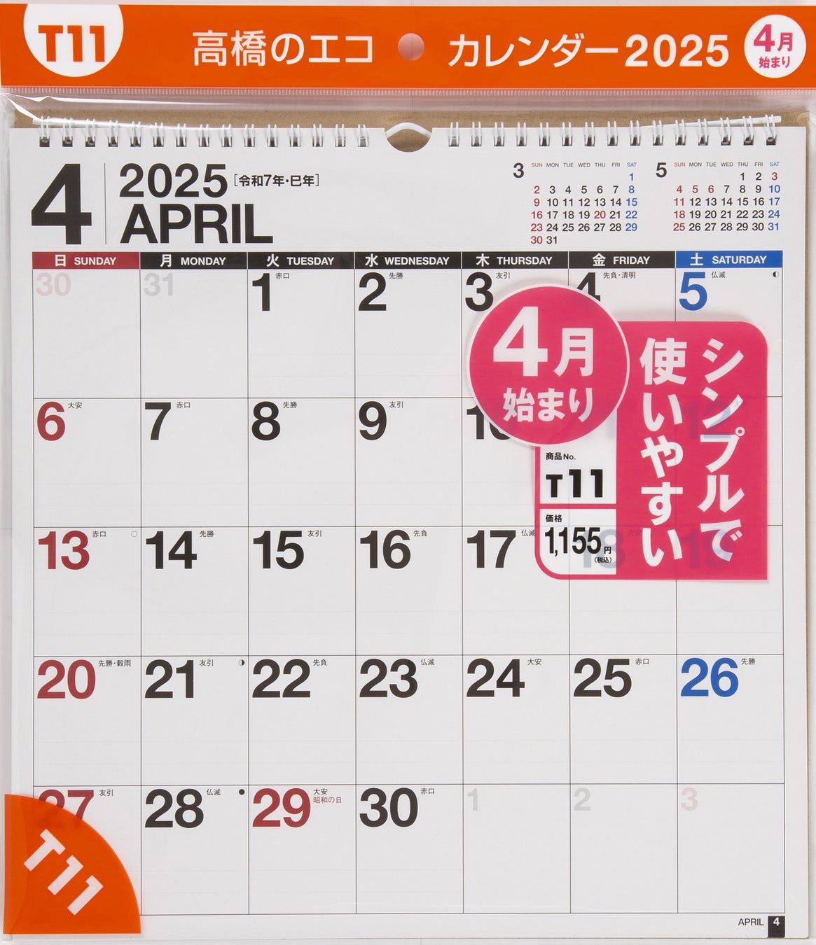 高橋書店の1月始まりエコカレンダー全98点(※2025年版)の中でも売れ行き上位の、選りすぐりのアイテムを4月始まりエコカレンダーとして発売いたしました。