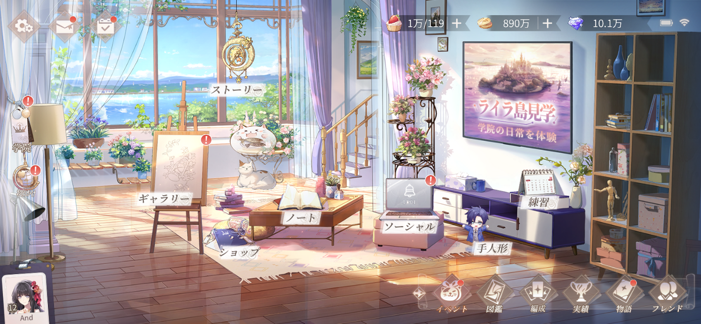 現実世界では、大学での日常を楽しめます。主人公の部屋(メイン画面)にある【ノートパソコン】でSNSをチェックしたり、自分の【手人形】を着せ替えて独自の小劇場を創作し、フレンドに観てもらったりすることもできます。