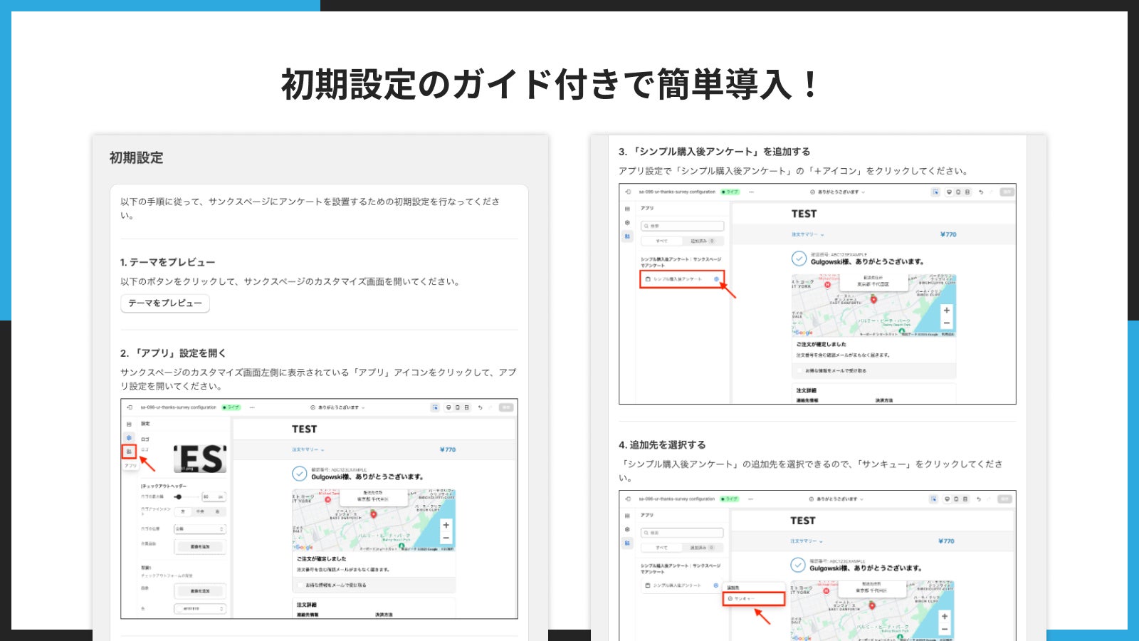 「シンプル購入後アンケート|サンクスページでアンケート」は、購入完了後のサンクスページにアンケートフォームを設置することで、顧客の声をリアルタイムで収集できるアプリです。フィードバックを通じて顧客満足度を可視化し、サービスや商品の改善に活かすことができます。設定はすべてアプリの管理画面から行えるため、誰でも簡単に運用を始めることができます。