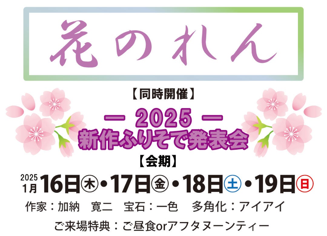 企画内容:加納寛二の作品展示販売・ジュエリー一色による宝飾品展示販売・特選五番街・敷布団アイアイ販売・2025年新作振袖発表会