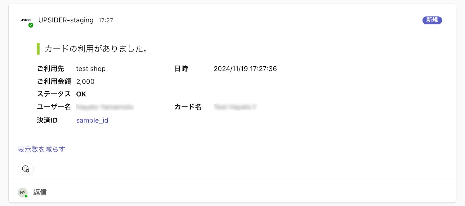 Microsoft Teamsにおいて、UPSIDER決済後に即時通知を受け取ることが可能です。通知内容には、利用先名、利用金額、利用日時、対象カード名、ユーザー名、決済IDが含まれ、企業の経理担当者・従業員は即座に決済内容を確認することができます。