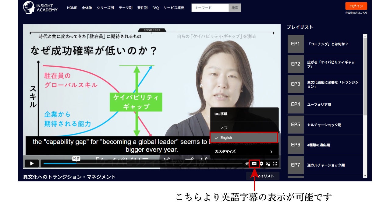 グローバル人材育成・研修業を手掛けるインサイトアカデミー株式会社(本社:東京都港区六本木、代表取締役:北村 嘉章)は、グローバル人材育成eラーニング「INSIGHT ACADEMY」の講座にて英語字幕の対応を開始し、一部に実装しました。