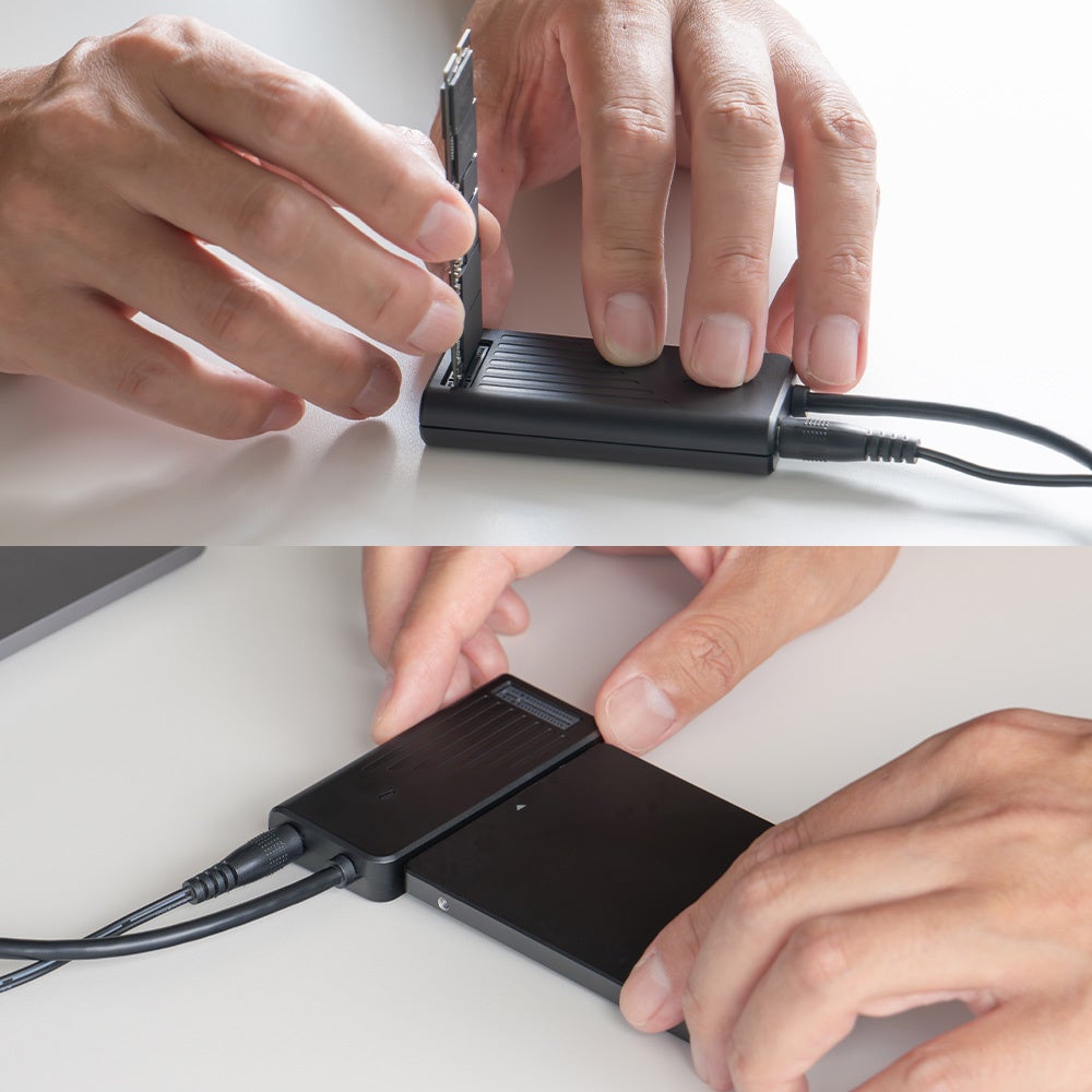 ドライバーなどの工具を用いずに各種ドライブを簡単に接続できます。本製品にM.2 NVMe SSDとSSD/HDDを直接挿し込むだけで使用可能です。