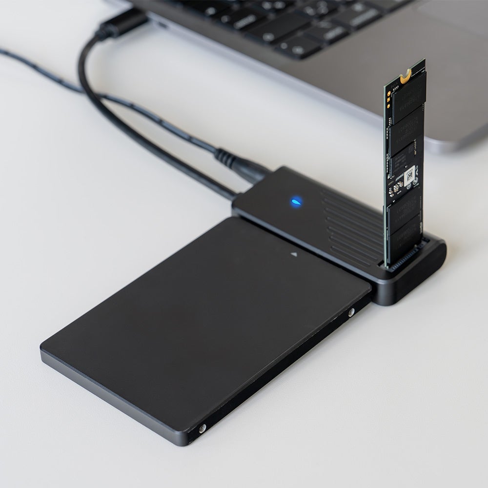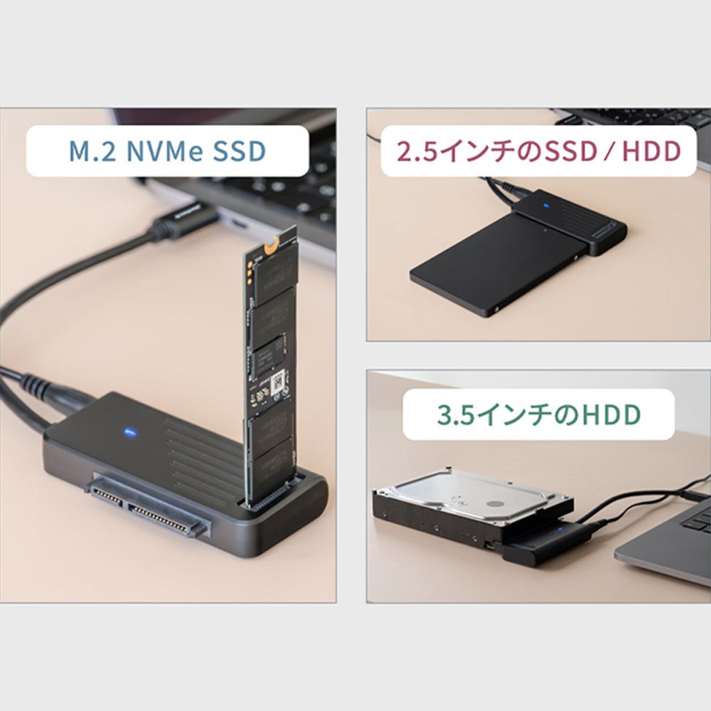 本製品はACアダプター付属のインターフェース変換アダプターです。M.2 NVMe SSDと一緒に2.5インチのSSD/HDDや3.5インチのHDDを接続できるため、お手持ちのPCで使用するドライブのアップグレードやデータの移行、バックアップなどに最適です。