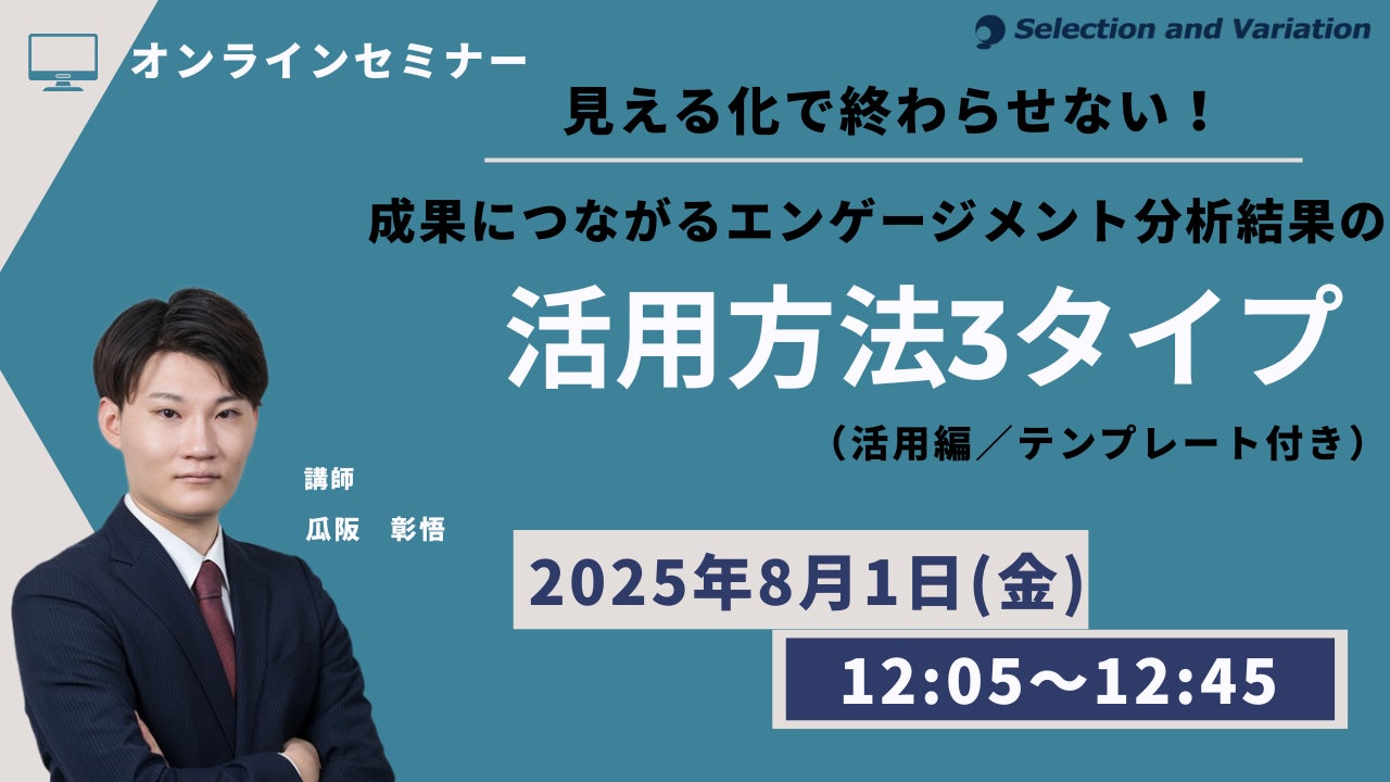 組織・人事コンサルティングファームであるセレクションアンドバリエーション株式会社(以下、当社、東京都千代田区丸の内、大阪市西区、名古屋市西区 / 代表取締役社長:平康慶浩/ URL:https://sele-vari.co.jp/ )は『見える化で終わらせない!成果につながるエンゲージメント分析結果の活用方法3タイプ(活用編/テンプレート付き)』セミナーを2025年8月1日(金)12:05〜12:45に開催することをお知らせいたします。