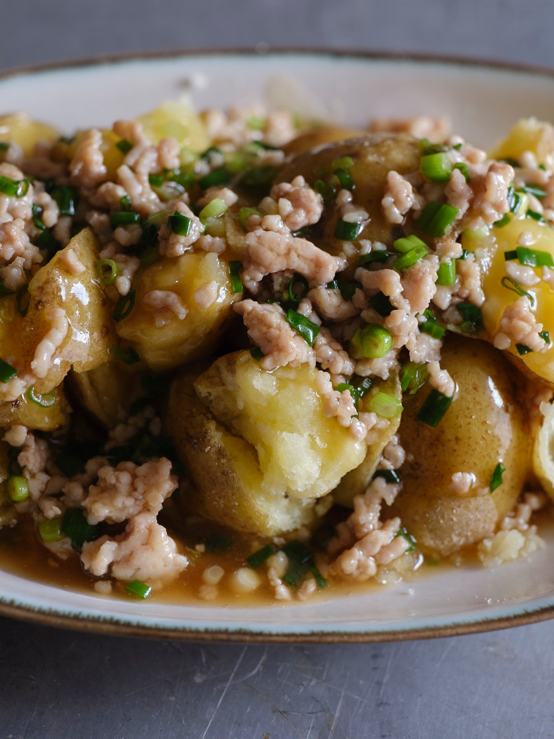 新じゃがのそぼろあんかけ(左)、焼きなすのごまソース(右)