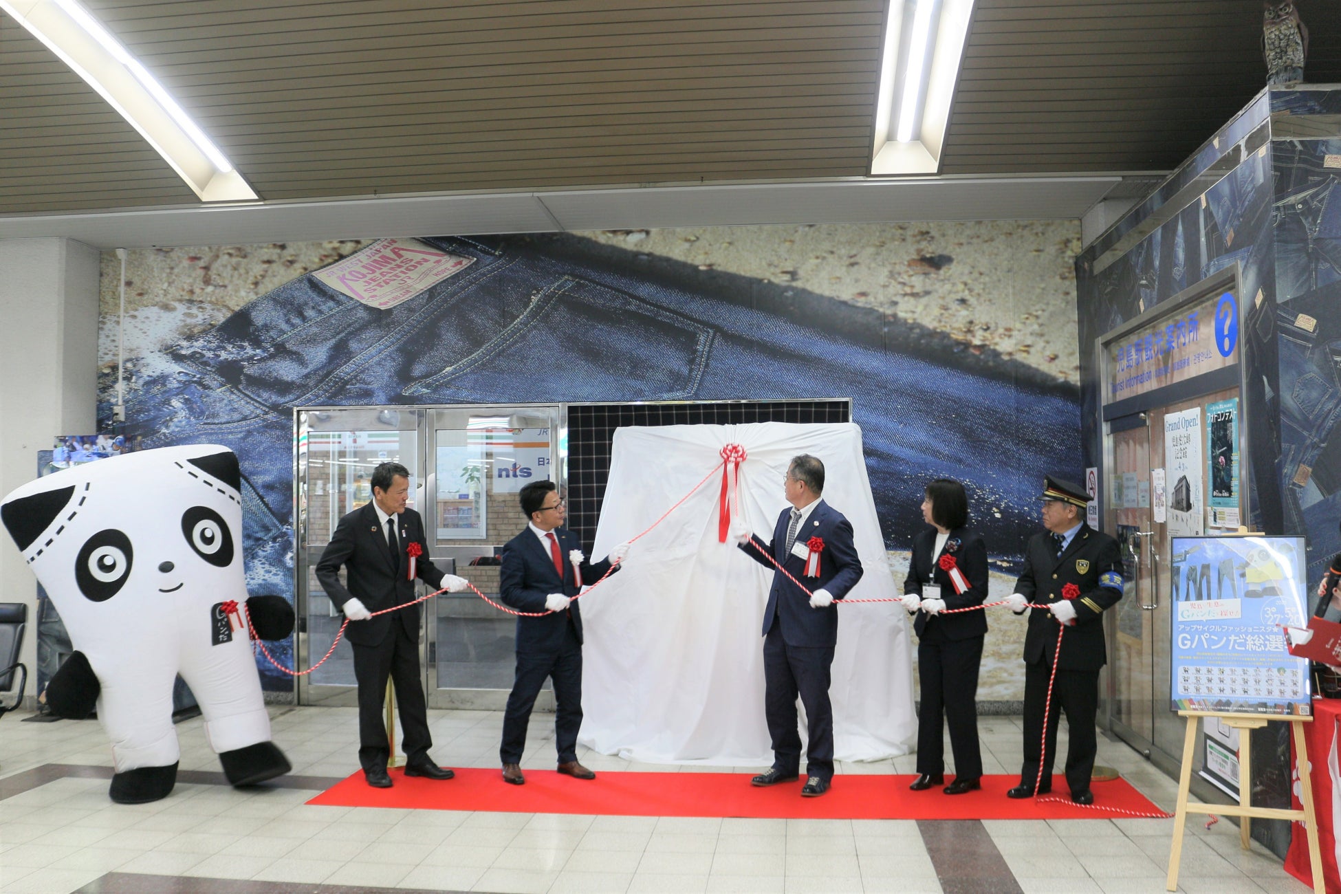 菅公学生服株式会社 (本社:岡山市北区駅元町 代表取締役社長:尾崎 茂 以下:カンコー学生服)は、2025年3月27日(木)に、JR児島駅において、児島アートプロジェクト<第一弾>制服の余り生地をアップサイクルしてつくるエコフラワーでできた「Gパンだ」像の除幕式を開催しました。