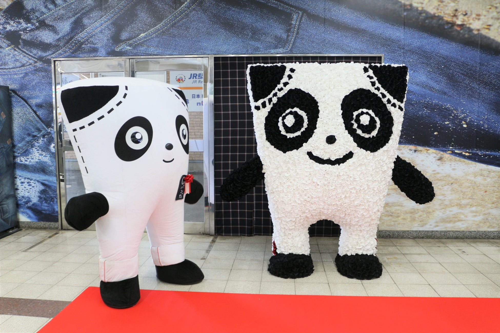 児島アートプロジェクト<第一弾>制服の余り生地をアップサイクルしてつくるSDGsエコフラワー約1万本でできた「Gパンだ」像がJR児島駅にお目見え!