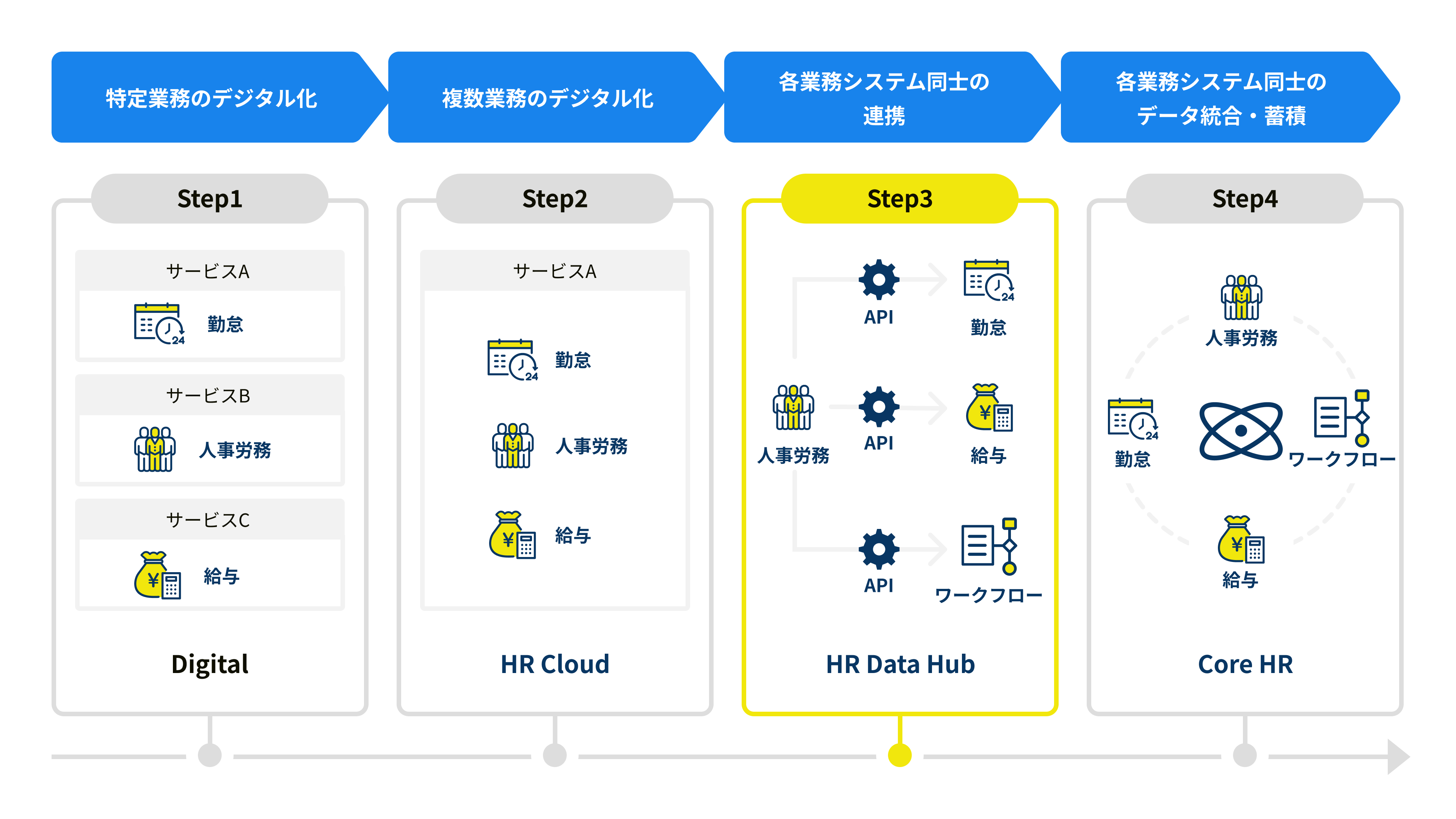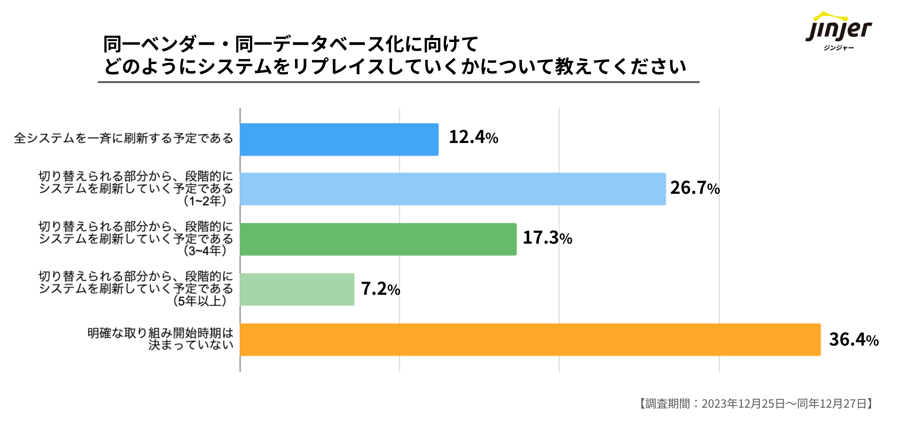 各社が統合型データベースを用いた人事関連システムの活用を目指していく一方で、現在使用中の人事関連システムの契約期間がシステムによって異なるため、また、一斉にシステムを統合することによる管理者や従業員の工数増加などの課題があるため、一度にシステムを全面的に更新するのは難しいケースもあります。