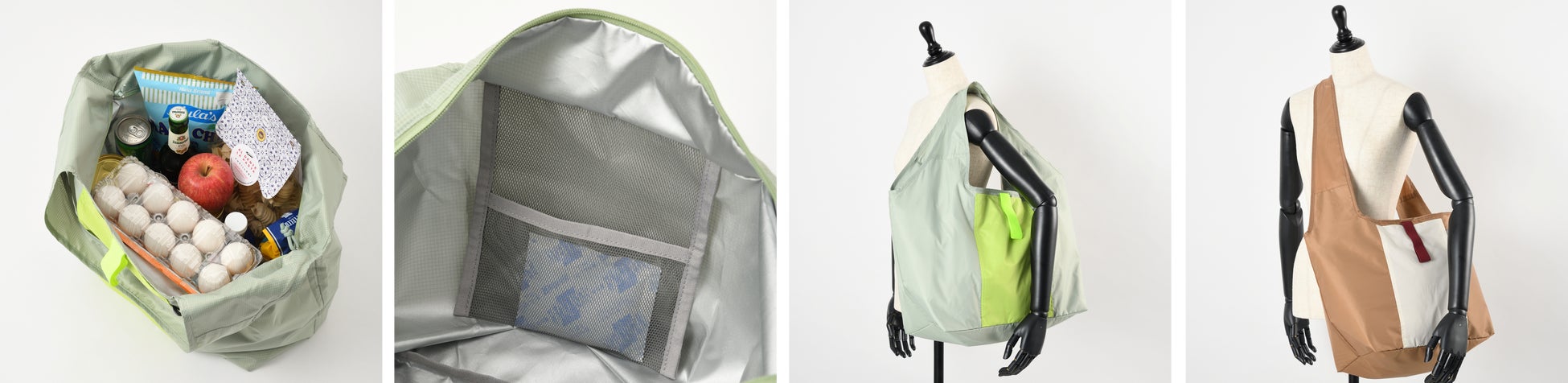 レジかご約1つ分をカバーする「トート」と、両手が自由になるクロスボディ対応の「ショルダー」の2型展開。