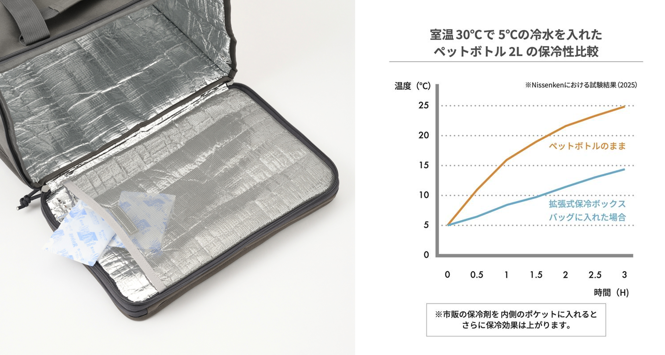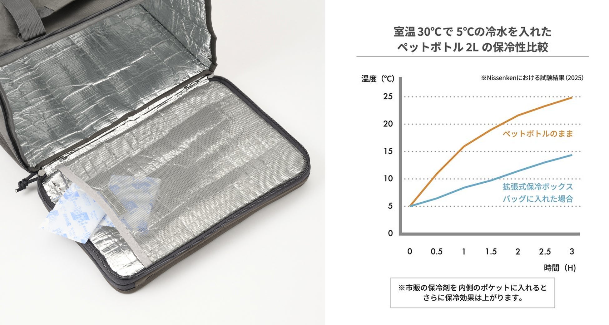 内装には厚手の断熱材とアルミ蒸着素材を採用し、外気温の影響を最小限に抑えます。