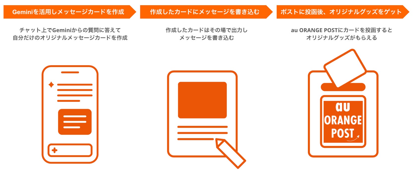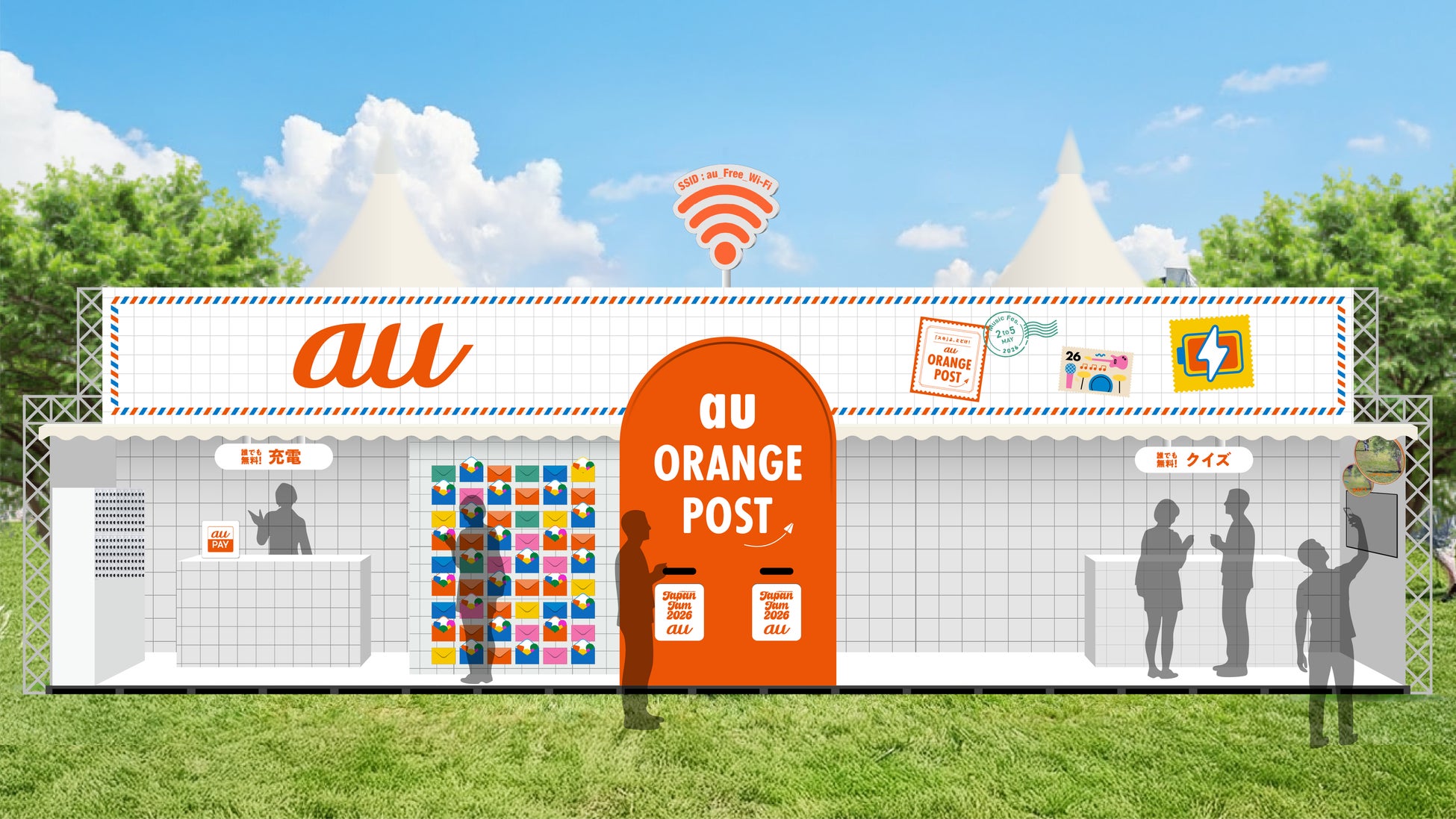 混雑する会場内でも快適に過ごせる5GやStarlinkなどの通信に加え、終日開催のイベントにも安心して参加できるスマートフォンの無料充電サービスや、auブースのフェスオリジナルグッズがもらえる特典、生成AIで作成したイラストにメッセージを書いてポストに投函し想いを届けるコンテンツ「au ORANGE POST」などを提供します。