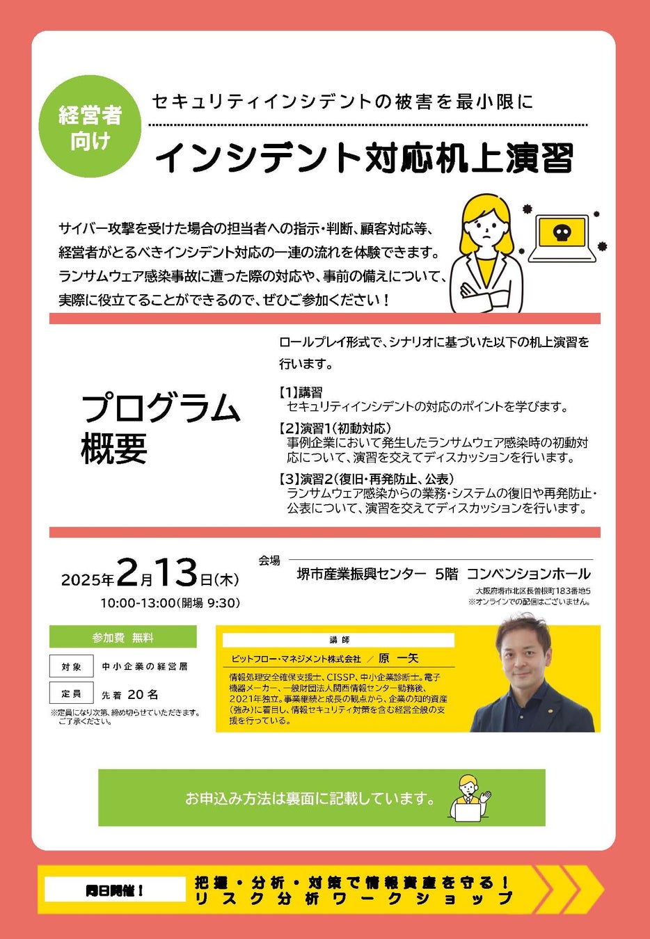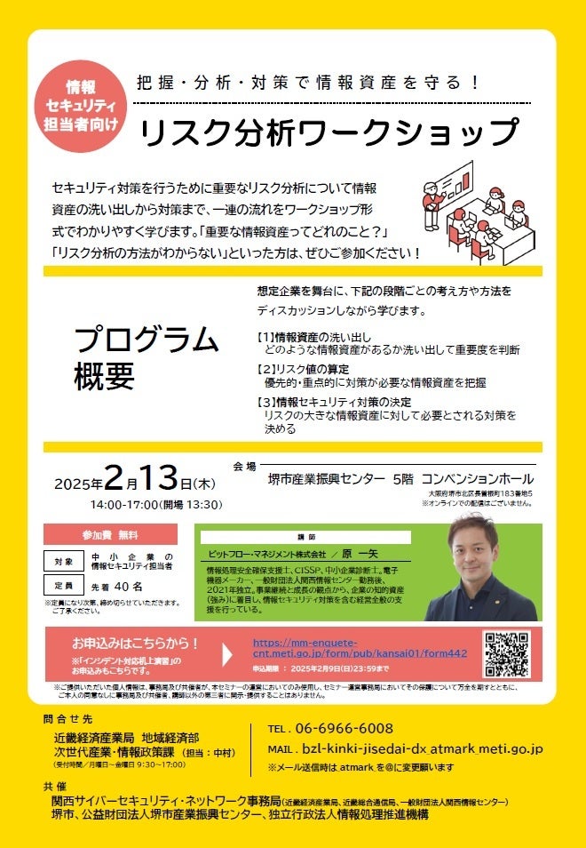 独立行政法人情報処理推進機構(IPA)及び関西サイバーセキュリティ・ネットワーク事務局(近畿経済産業局・近畿総合通信局・一般財団法人関西情報センター)は、堺市、公益財団法人堺市産業振興センター、独立行政法人情報処理推進機構と共催で、サイバーセキュリティ月間(※)中である令和7年2月13日(木曜日)に「経営者向けインシデント対応机上演習」及び「情報セキュリティ担当者向けリスク分析ワークショップ」を同日開催します。