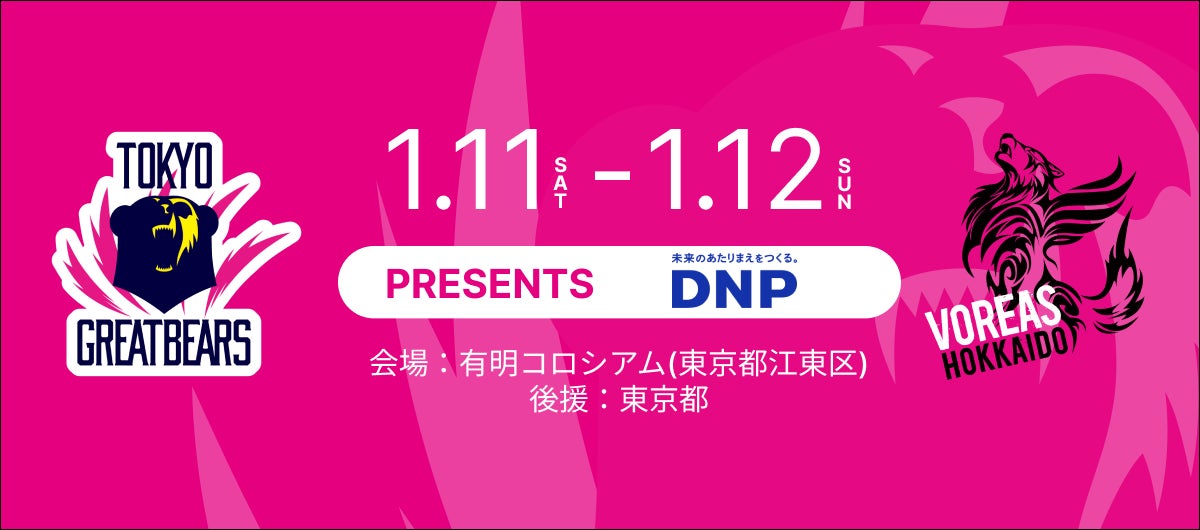 株式会社グレートベアーズ(本社:東京都渋谷区、代表取締役:久保田健司)は、2025年1月11日(土)、12日(日)に有明コロシアムにて開催される2024-25 大同生命 SV.LEAGUE MEN 東京グレートベアーズ ホームゲーム ヴォレアス北海道戦 において、東京グレートベアーズ オフィシャルパートナーである、株式会社DNPエスピーイノベーションをマッチデースポンサーとして、ホームゲームを開催することとなりましたのでお知らせいたします。