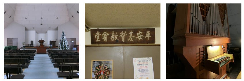 階段を上がっていくと、椿の小径を見下ろせるテラスに続いて会堂のホール、その奥に礼拝堂があります。礼拝堂の北側と南側は天井から床までが全面ガラス窓で、日曜日の礼拝の時には朝の日差しが差し込みます。プロテスタントの教会らしく、シンプルですが親しみやすく明るい礼拝堂です。1976年には教会創立100周年を記念して念願のパイプオルガンが設置されました。