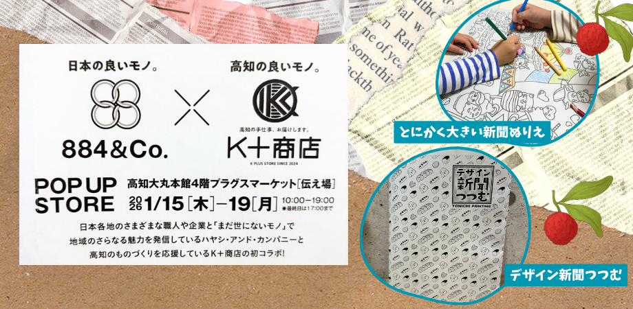 世界最大級の新聞印刷会社である東日印刷株式会社(本社:東京都江東区、代表取締役社長:西川光昭、以下TONICHI)は、2026年1月15日(木)~19日(月)に高知県で開催されるポップアップストア「日本の良いモノ。高知の良いモノ。」 に出店いたします。今回のポップアップでは、TONICHIが新聞印刷の現場から生まれたアップサイクル商品、デザイン新聞 「つつむ」 や 「とにかく大きい新聞ぬりえ」 を販売します。当社にとって百貨店への出店は今回が初めて。さらに、東京・神奈川以外では初の地方出店となり、高知の皆さまに直接販売させていただきます。素材感や使い心地を、どうぞ直接手に取ってご体感ください。