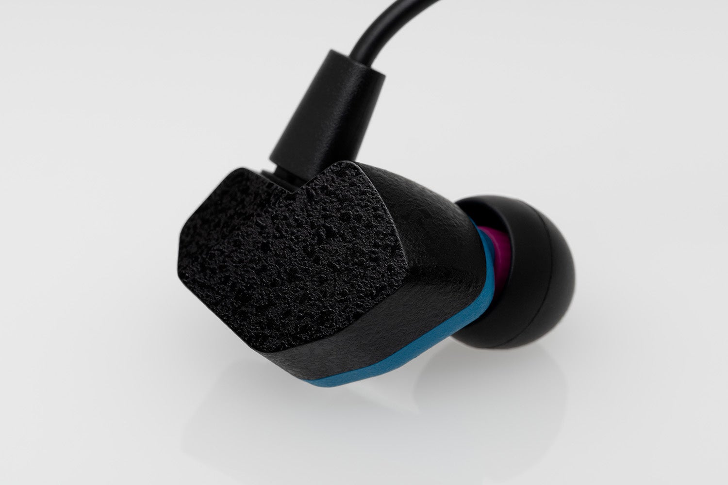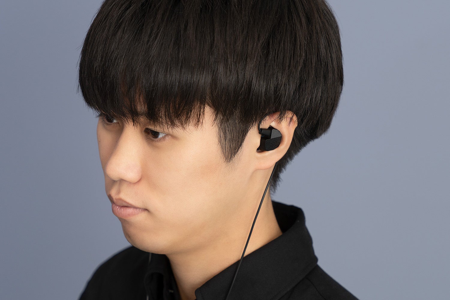 A2000では、Bseriesの開発で確立したIEMの最適解である筐体設計をベースに、より優れた装着感を実現しています。イヤホンの装着感が優れているか否かは、圧迫感で決まります。人間工学を謳い有機的な形状を選択するなど、シリコンの反発力で保持する方法は一見正しく見えますが、常に耳に力がかかることとなり、気付かない内に耳へ負担を掛け、疲労が蓄積します。有機的で大きな面で耳に接する形状に比べ、接触面積を限定する形状により、圧迫感の無い装着感を目指しました。