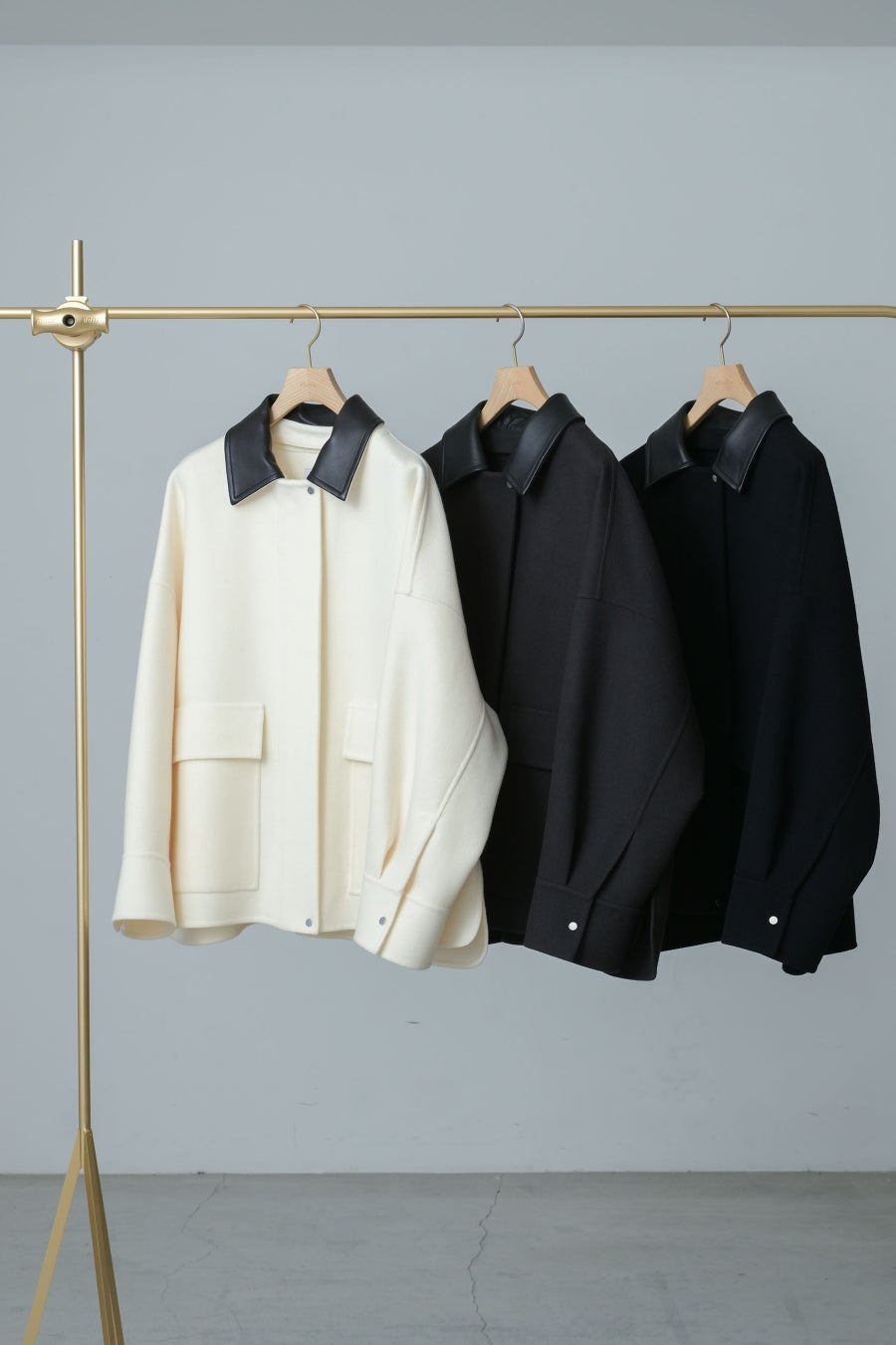 取り外し可能なレザーの襟が印象的で、クラシカルなシャツ型のフォルムに、モダンなエッセンスを添えています。襟を外せば、ミニマルなノーカラーアウターとしても楽しめる2way仕様。