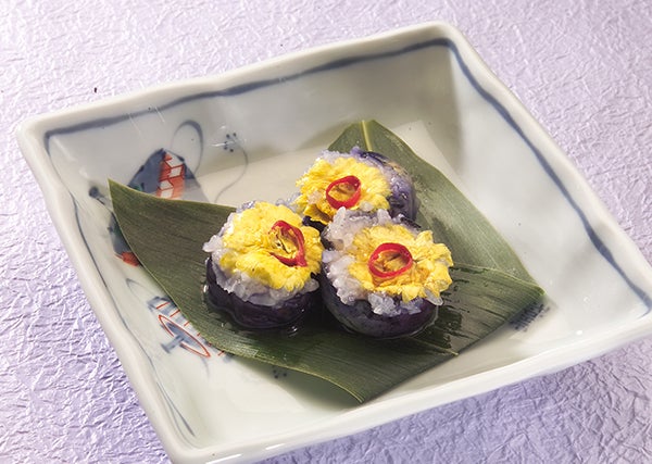 花ずしは、主に秋田県で作られる伝統的な漬物で、なすの中に食用菊や唐辛子、餅米を詰めて漬け込む料理です。色彩豊かで、なすの青、菊の花の黄色、唐辛子の赤が特徴的です。