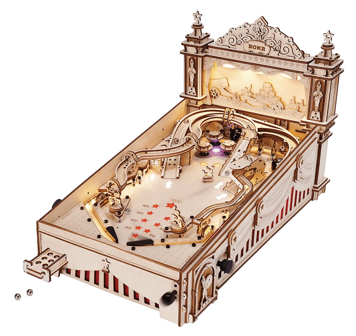 つくったあと、ピンボールとして遊べる3Dウッドパズル。右下の黒いレバーをひっぱると発射される球をはじき、盤面の的に当てることで得点を重ねていくゲームです。いくつかセンサーが付いており、センサーのある箇所を通ったり、盤面の的に当たったりすると音が鳴り、LEDライトが光ります。