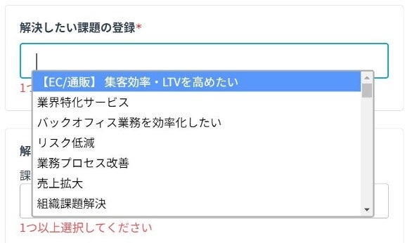 プロフィール情報を入力する際、「解決したい課題の登録」「解決できる課題の登録」それぞれの項目のタブで、「集客効率・LTVを高めたい」「業界特化サービス」「バックオフィス業務を効率化したい」など62種類の選択肢から1つを設定していただけます。