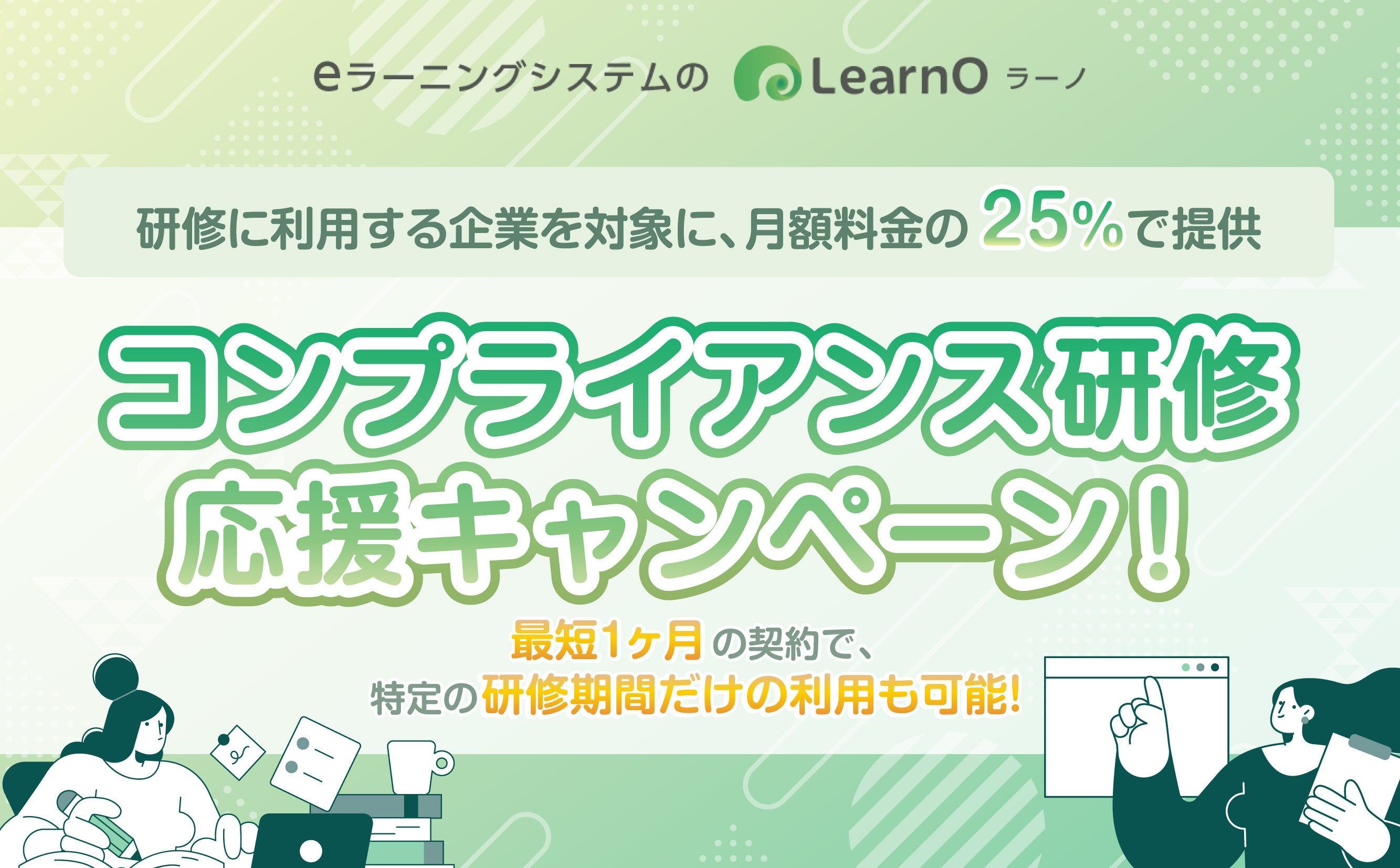そこでこの度、eラーニングによるコンプライアンス研修をコスト面から応援するキャンペーンを実施いたします。対象期間内のご契約で、LearnOを月額費用の25%OFFで提供いたします。