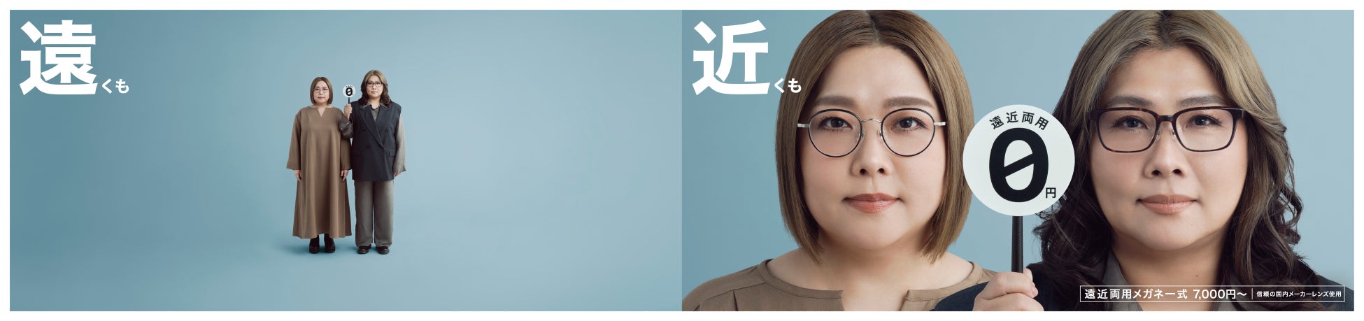本CMでは、遠くも近くも見えるレンズが一体となった遠近両用レンズの特徴を伝えるため、姉妹漫才師のやすともさんが“合体”するなど、彼女たちらしい掛け合いやユニークな演出によって、楽しさの中にもメッセージがしっかりと伝わる内容となっています。