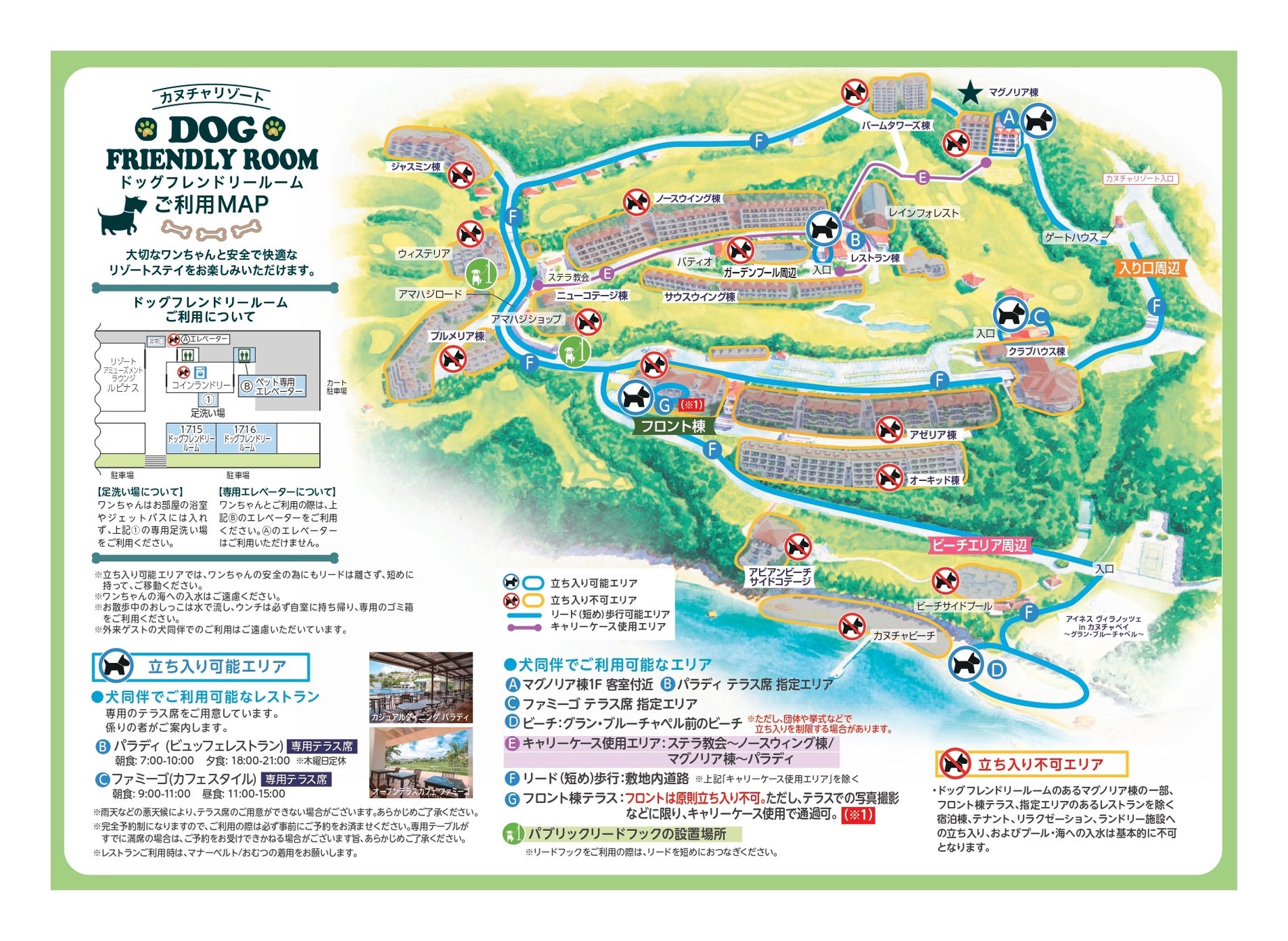 ペット同伴専用ルームのあるマグノリア棟周辺の緑豊かなコースや、おみやげショップや居酒屋などが建ち並ぶアマハジロード、ヤシの木と青い海がマッチするビーチエリアなどのリゾート内の特定エリアを愛犬同伴可のお散歩コースに設定しました。カヌチャならではの景色の中で普段の生活にはないひとときをお過ごしいただけます。