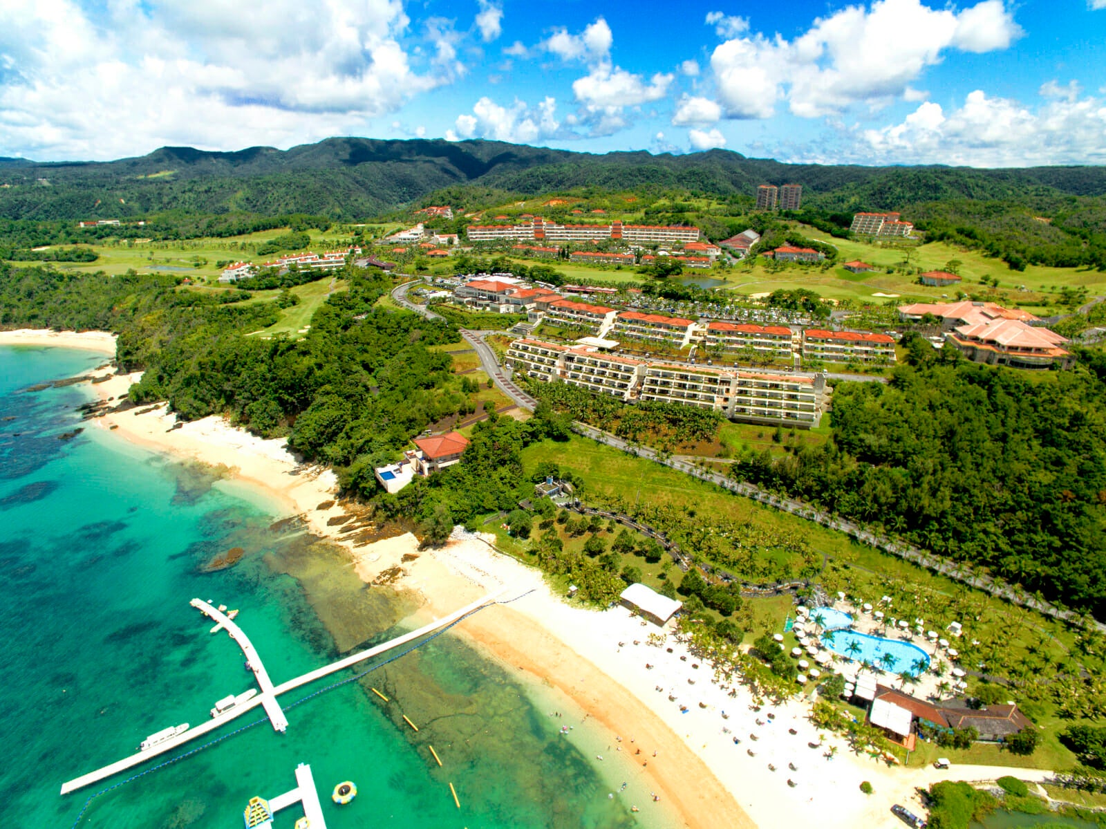 約80万坪(東京ドーム60個分)という広大な土地に、全室約50平米以上のウッドテイストに満ちた客室を抱えた8スタイルのホテル棟、バラエティに富んだレストランに加え、本格的なゴルフコース、ビーチとプール、70種類以上のアクティビティを有し、一つの「街」のような感覚で沖縄ステイをお楽しみいただけます。