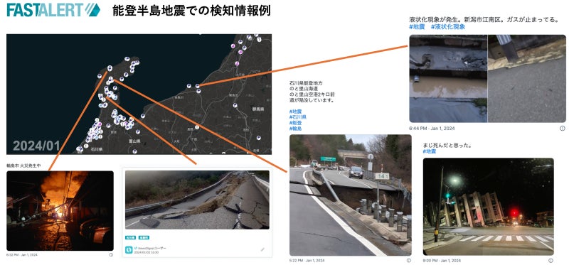 当社はAIビッグデータリスク情報センサ「FASTALERT(ファストアラート)」を開発・運営し、SNSをはじめとする住民の目撃情報などを収集・分析しています。能登半島地震でも、報道機関や地方自治体、警察・消防、インフラ企業などにリアルタイムの災害目撃情報を提供してまいりました。