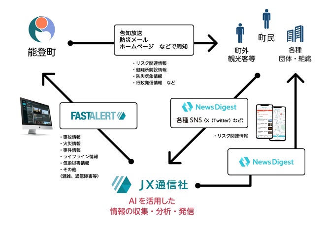 本協定では、当社が開発・運営している無料ニュースアプリ「NewsDigest(ニュースダイジェスト)」やX等のSNSプラットフォームを通じて町民や地域団体等からの情報収集を行い、当社にて偽・誤情報の排除や発生位置の推定を実施したうえで、「FASTALERT」と「NewsDigest」を介して信憑性の高い情報を地図上でわかりやすく発信するといった、新しい情報流通の仕組みの構築を目指すものです。