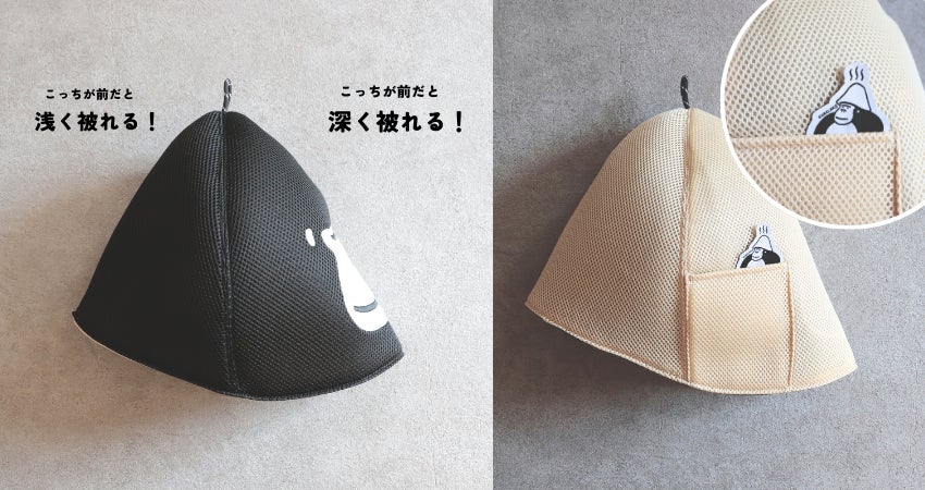 この瞑想メッシュハットは冒頭でも説明した、【瞑想サウナハット】の機能を継承しているので、使用時、前後を逆にすることで【サウナに集中したい時は深く被る】【外気浴で顔は隠したいけど呼吸を楽にしたいときは浅く被る】など、シーンに応じて使い分けが可能。