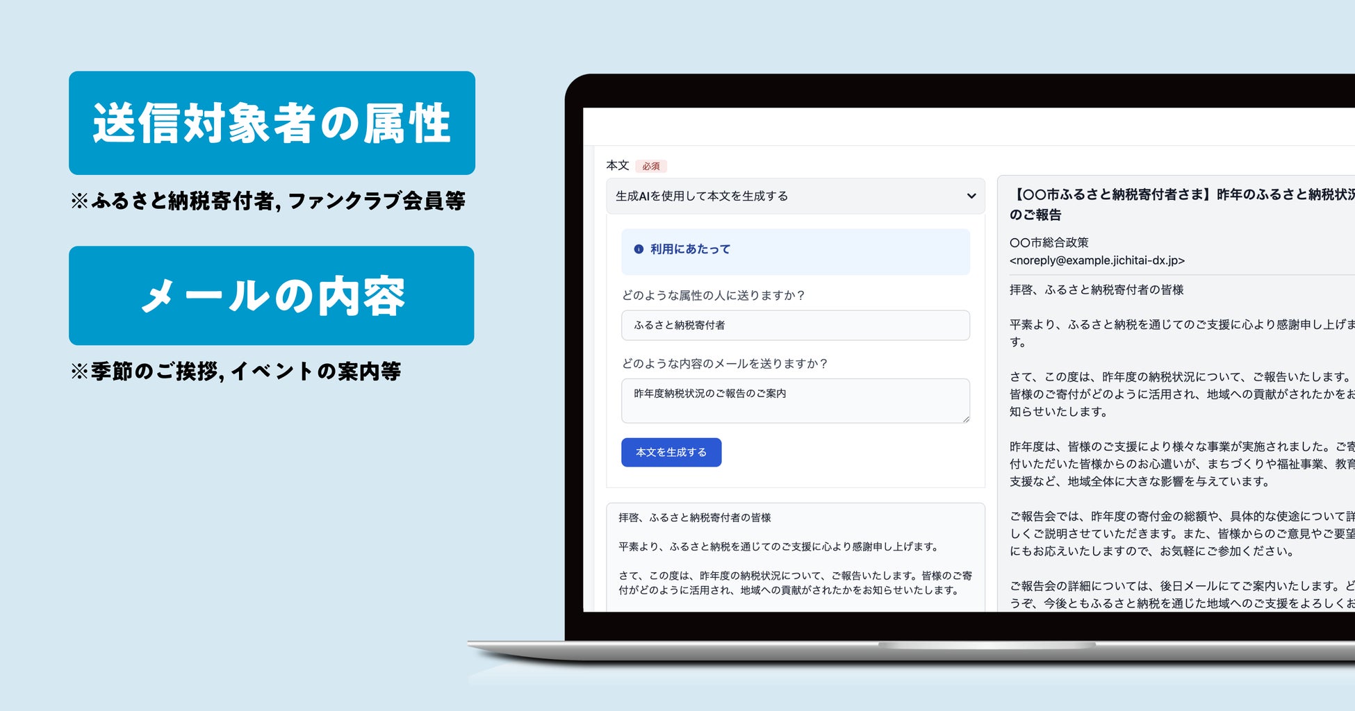 本機能は自治体さまからのご要望をもとに開発を行い、メール配信業務の効率化と効果的な情報発信を両立させることを目的としています。「誰に」「どのようなメールを送りたいか」の条件を入力することで、自動でメールの例文をAIが生成。例文をもとにより短時間で最適なメール作成・配信が可能となり、定期的かつ対象者にあわせた細やかな地域からの情報発信を実現。関係人口とのつながりを育みます。