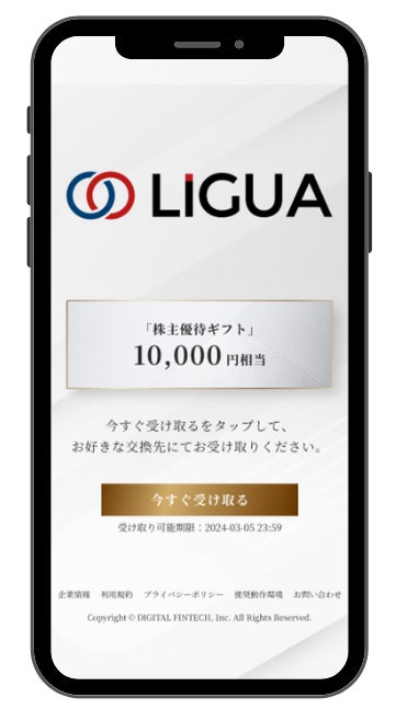 株式会社リグア(代表取締役社長:川瀨 紀彦、東証グロース市場:証券コード7090)において、株式会社デジタルプラス(代表取締役社長:菊池 誠晃、本社:東京都渋谷区、東証グロース市場:証券コード3691)の子会社である、株式会社デジタルフィンテック(代表取締役社長:菊池 誠晃、本社:北海道札幌市)が運営する「デジタルギフト®」を株主優待としてご活用いただくことになりました。