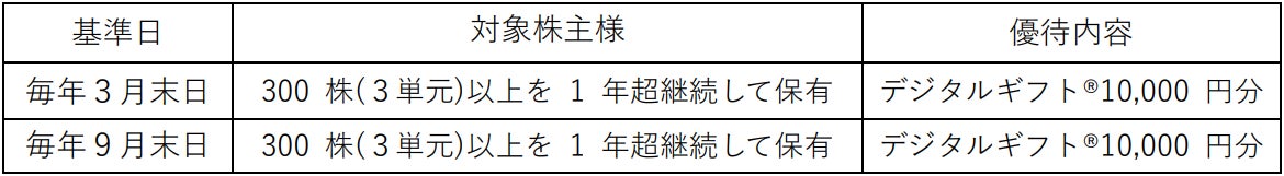 株式会社リグアの株式300株以上を保有されている株主様へ向けた、株主優待として、デジタルギフト®を優待品目としてご導入いただきます。株主様は、交換先の中からお好きな優待品目を選択することができます。