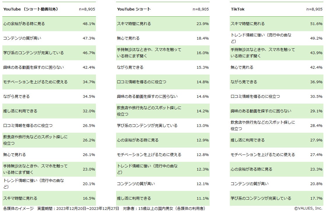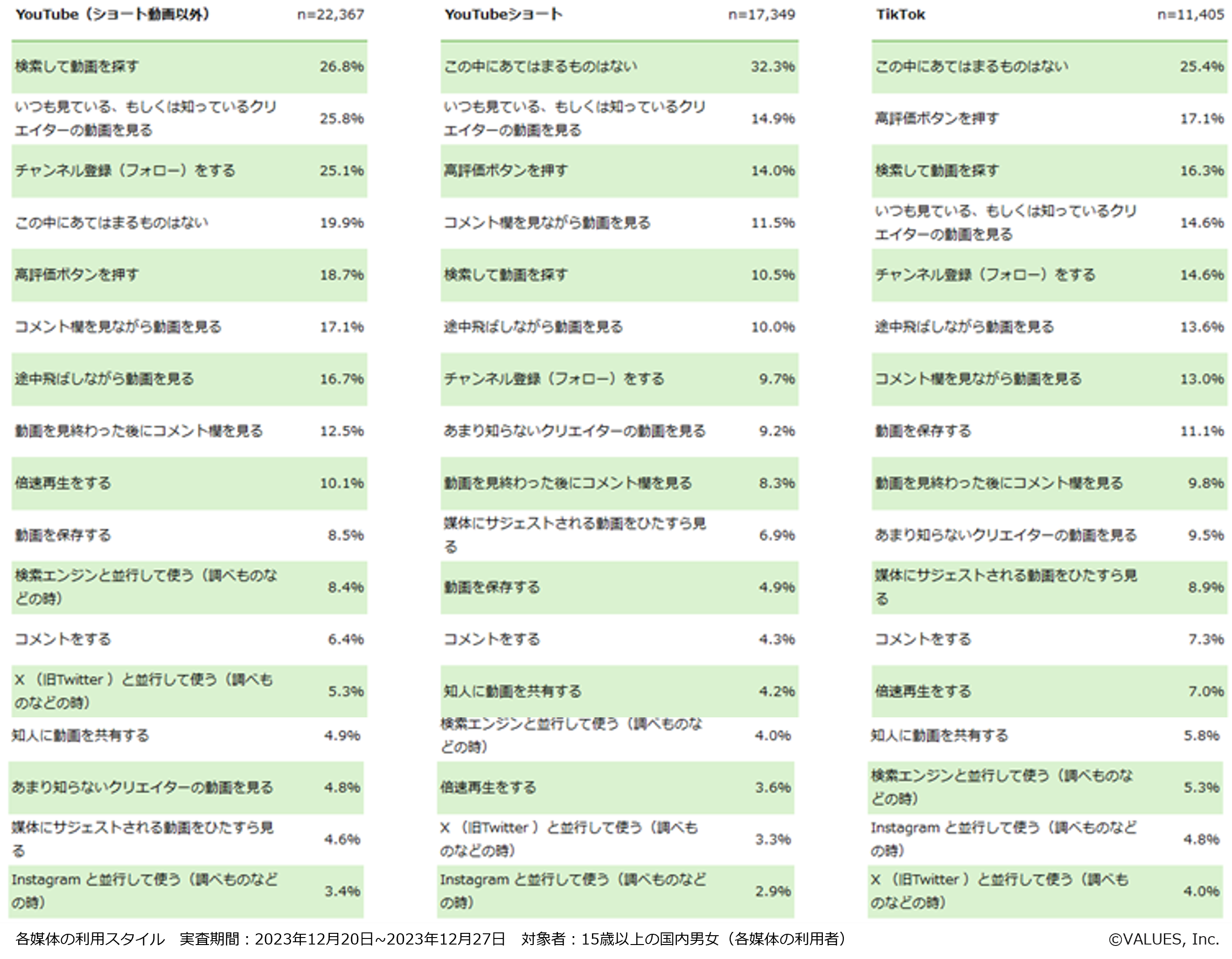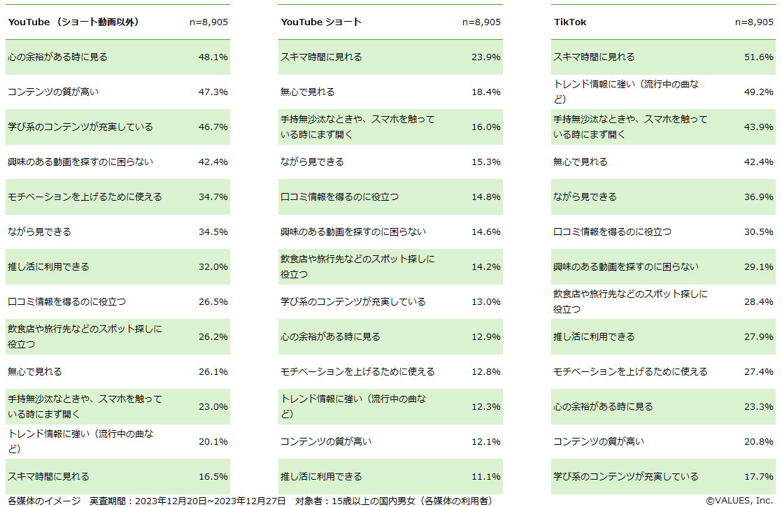 【調査・分析概要】 YouTube・YouTubeショート・TikTokの利用について、全国のヴァリューズモニター(15歳以上男女)を対象として、2023年12月20日~2023年12月27日にアンケート調査を実施(回答者 27,519人)。 ※アンケート調査は性年代別人口とネット利用率に合わせたウェイトバック集計をおこなっている。 |