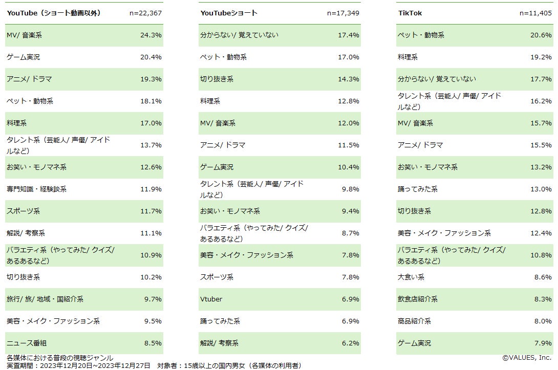 YouTubeではBGM・ながら見の需要からか、「MV/音楽系」「ゲーム実況」が20%を超えてトップとなっています。じっくり視聴したい需要が予想される「専門知識・経験談系」が、YouTubeショート(16位)やTikTok(19位)より高いのも特徴的です。