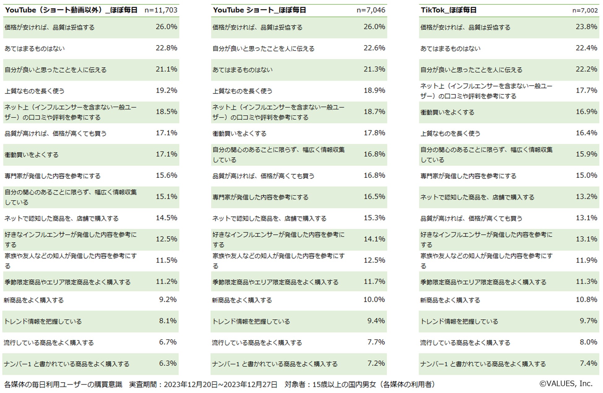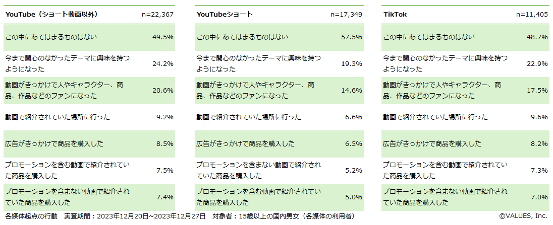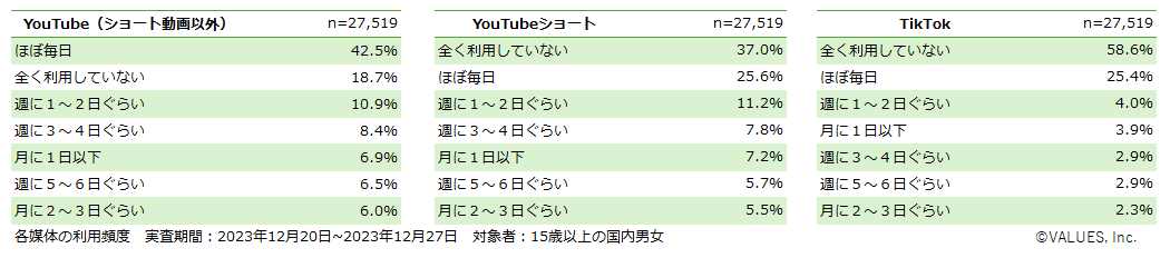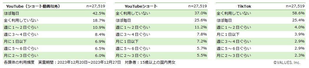 インターネット行動ログ分析によるマーケティング調査・コンサルティングサービスを提供する株式会社ヴァリューズ(本社:東京都港区、代表取締役社長:辻本 秀幸、以下「ヴァリューズ」)は、国内の15歳以上の男女27,519人を対象に、YouTube・YouTubeショート・TikTokの利用に関する消費者アンケート調査を実施しました。