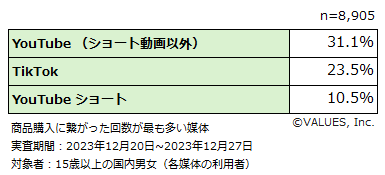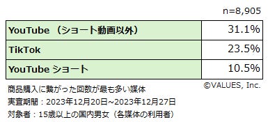 3媒体全て「利用あり」と答えた人に対して、商品の購入に繋がった回数が最も多い媒体を選択してもらった結果、YouTube・TikTok・YouTubeショートの順に割合が高く、それぞれ約3割、2割強、約1割となっていました。今後TikTokでの購買経験が増えていくのか、モニタリングしていきたいところです。